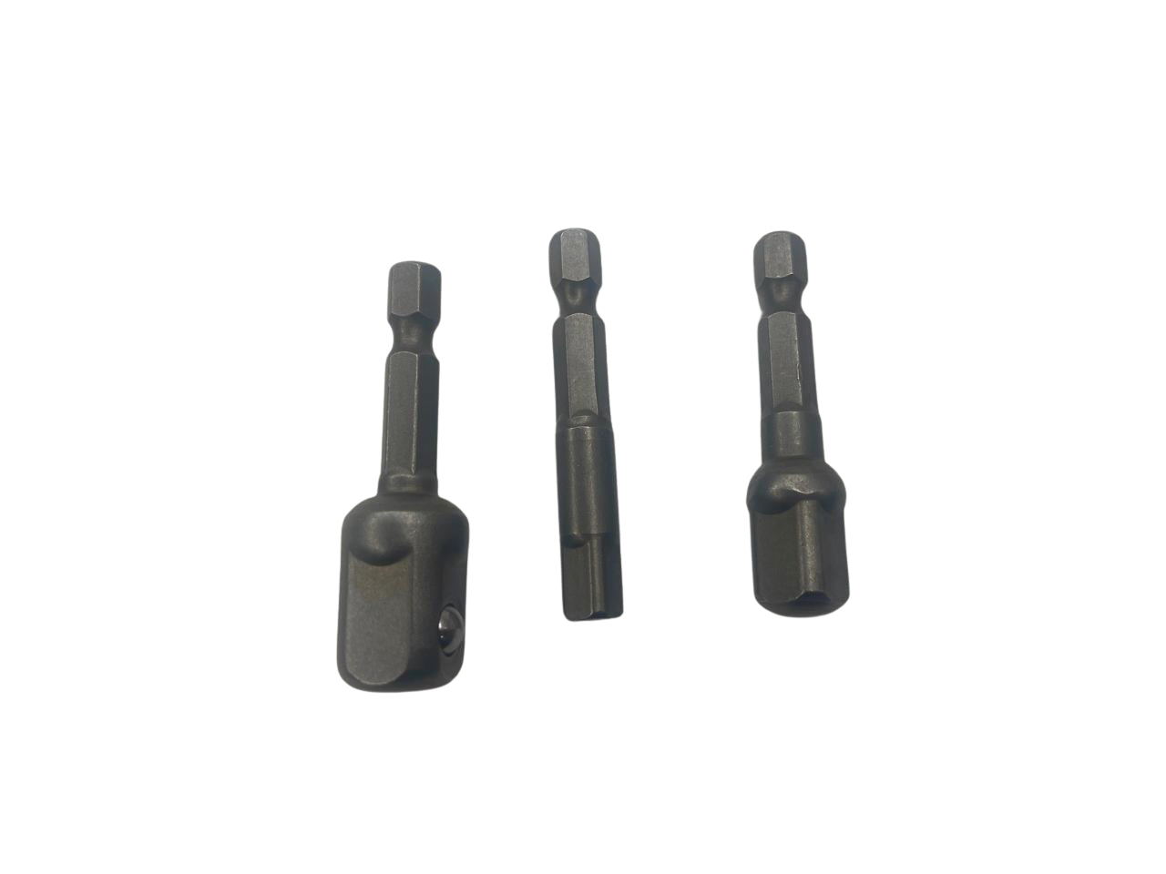 Durable Chrome Vanadium Steel Drill Socket Adapter Set with 1/4″, 3/8″, and 1/2″ hex shank extensions. Converts your drill into a socket driver — perfect for power tools, impact wrenches, and DIY repair work.