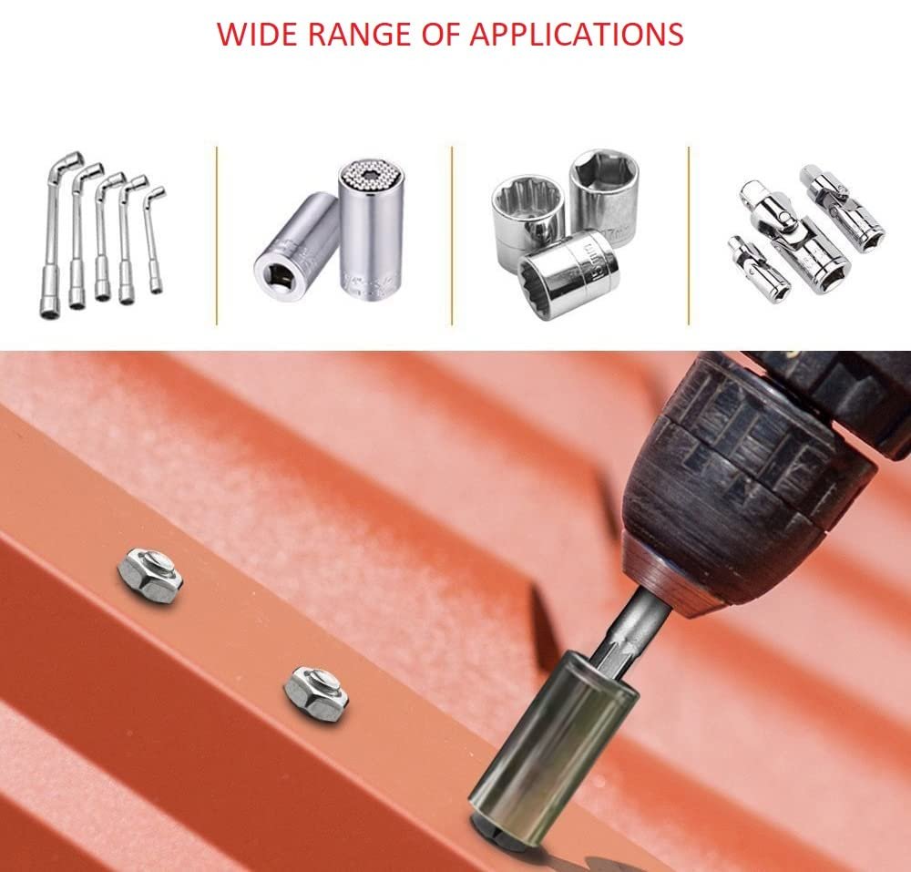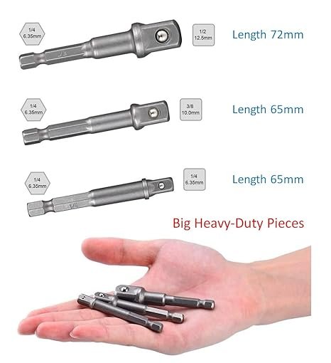 Made from premium chrome vanadium steel, each adapter offers high strength, corrosion resistance, and long-lasting durability. The spring-loaded ball bearing design ensures a secure socket fit, while the hex shank fits standard drill chucks for stable torque transfer.