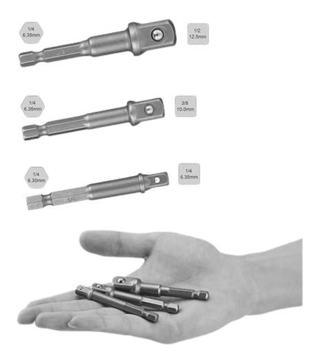 • Set includes 3 adapters: 1/4″, 3/8″, 1/2″ drive sizes